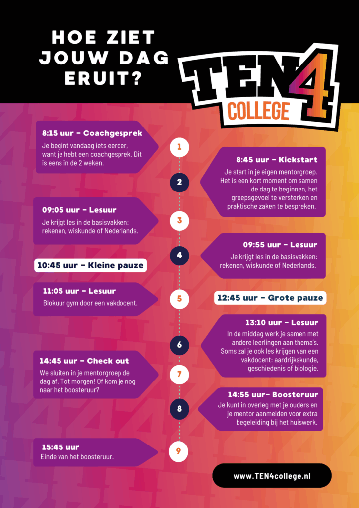 Hieronder ziet u hoe een dagindeling eruit kan zien op het Ten4 college.